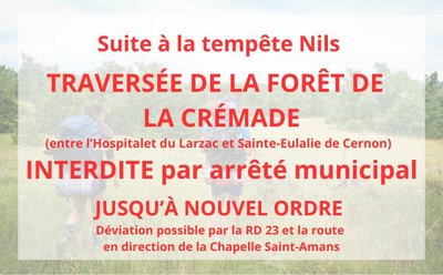 05/03/2026: Suite au passage de le tempête Nils, traversée de la forêt de la Crémade (entre l'Hospitalet du Larzac et Sainte-Eulalie) interdite par arrêté municipal jusqu'à nouvel ordre. Déviation possible en continuant sur le RD23 et en prenant la route qui mène à la chapelle Saint-Amans.