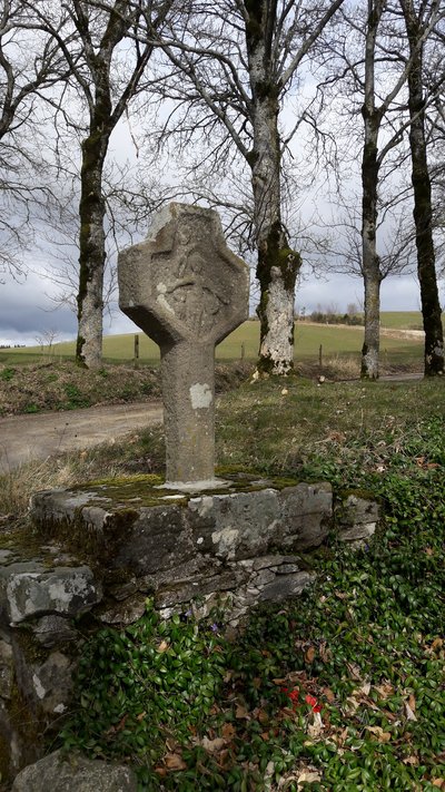 Au bout de l'allée conduisant au château, s'élève une croix en pierre de forme trapézoïdale. Il s'agit d'une croix "double", à savoir que ces deux faces sont ornées de sculptures. Sur un côté: le Christ baisse les bras au dessus de deux petits personnages qu'il semble protéger, l'ensemble est surmonté par un troisième personnage qui semble couronner le Christ ou s'envoler. Il s'agit sans doute du thème du Christ libérant les hommes par sa mort sur la croix ou leur ouvrant le Paradis. Sur l'autre face, nous pouvons observer l'image d'un crucifix à peine esquissée. Sur le socle figure la date 1751, ainsi qu'une inscription, issue d'une strophe du temps de la passion: "O crux ave spes unica", que l'on peut traduire par "salut O croix notre unique espérance".
