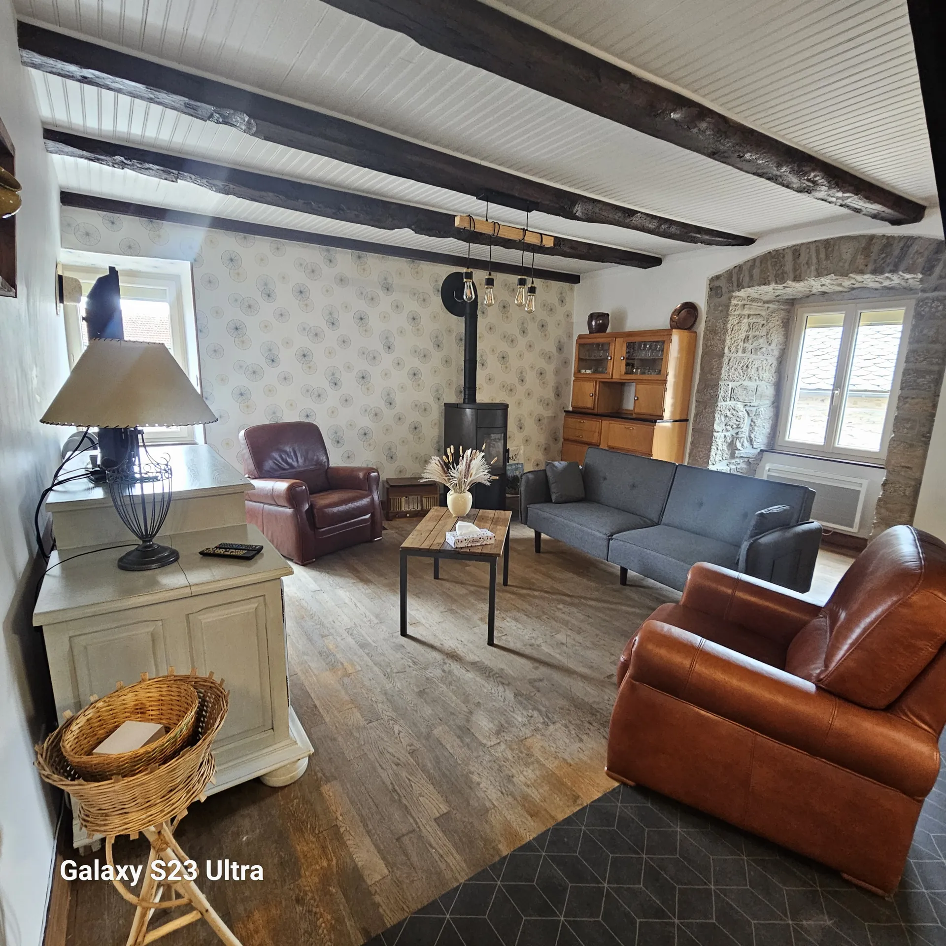 La maison individuelle dispose d'un jardinet privé et d'un salon de jardin. Vous emprunterez un escalier en pierre pour accéder à une grande pièce à vivre lumineuse, dotée d'un poêle à granulés, d'un canapé et de fauteuils. Un espace cuisine-coin repas avec tout l'équipement est disponible. À l'étage, 3 chambres, WC et salle d'eau sont aménagés.