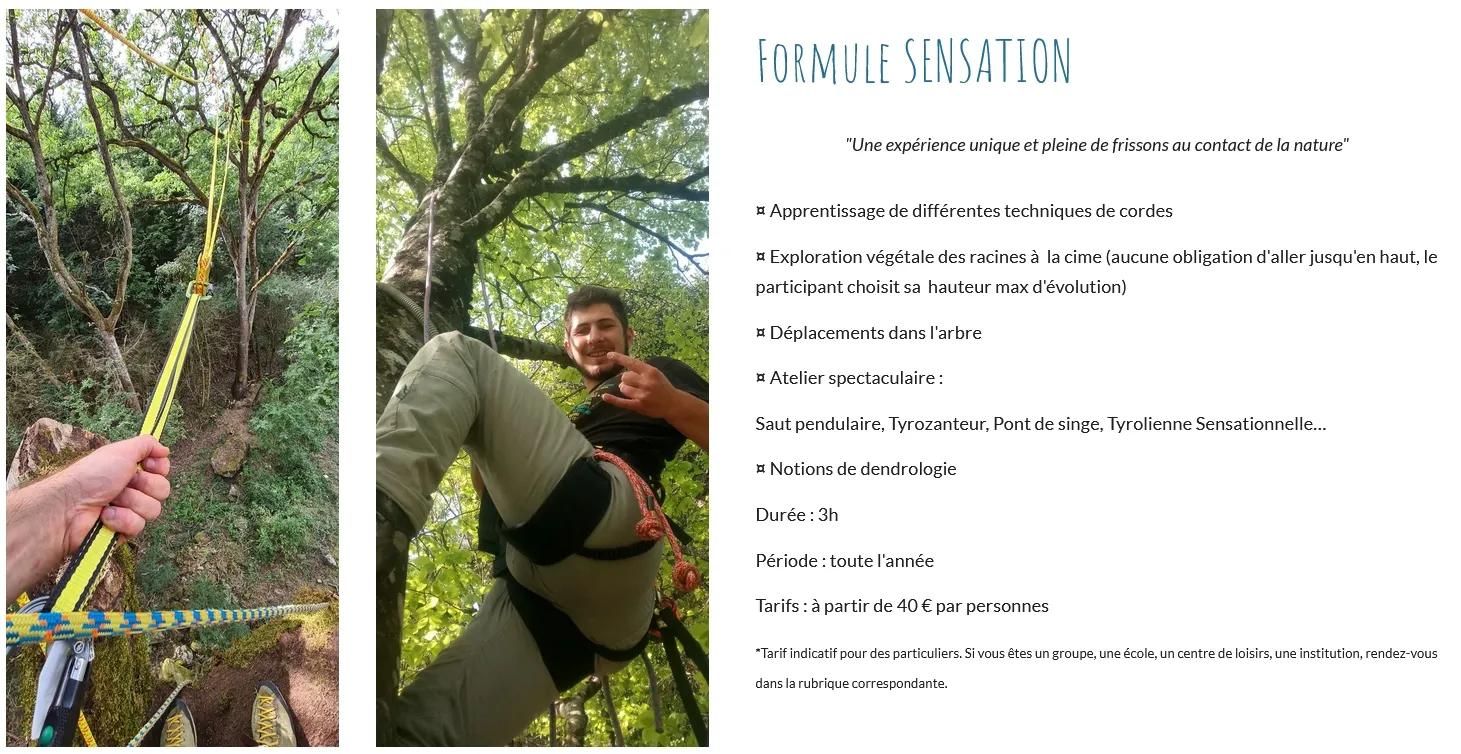 Premiers Pas, Apprentissage de différentes techniques de cordes, Exploration végétale des racines à la cime (aucune obligation d'aller jusqu'en haut, le participant choisit sa hauteur max d'évolution). Déplacements dans l'arbre. Notions de dendrologie.