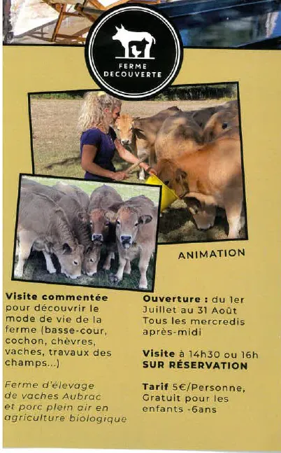 Vous découvrirez la basse-cour, les cochons, les chèvres, les vaches, travaux des champs, tout ce qui compose la ferme du Domaine du Charouzech....