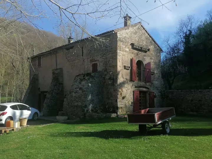 Gîte indépendant, 3 niveaux, à proximité du propriétaire et d'un autre gîte, en bordure de rivière, en pleine campagne. 4 chambres (4 lits 90, 2 lits 140), salles d'eau et bains, coin cuisine (lave-vaisselle, lave-linge) / séjour (cheminée), salon (canapé, 2 fauteuils, télévision), salon (canapés, fauteuils, cheminée). Chauffage électrique. Jardin non clos privé (250 m²), parking, salon de jardin, barbecue.