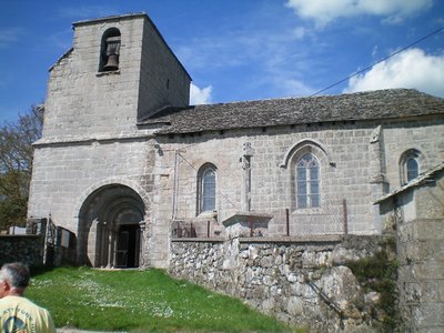 Eglise construite au 12e siècle, sans doute prieuré anciennement uni au chapitre de Rodez. La construction des chapelles s'échelonne du 14e au 16e siècle. En 1454, construction de l'escalier à vis du clocher. L'édifice, construit sur un plan roman, est à nef unique terminée par une abside semi-circulaire voûtée en cul de four. Sur la nef et le choeur, entre les contreforts, se greffent cinq chapelles voûtées d'ogives. La présence de niches à pinacles et le style du décor sculpté, confirment le caractère gothique des chapelles. La partie occidentale a été fortement remaniée. Le porche roman est orné d'une voussure à deux rouleaux et d'un arc souligné par un cordon de billettes. Les rouleaux reposent sur deux colonnes ornées de chapiteaux sculptés.