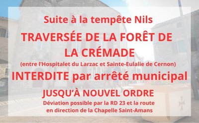 05/03/2026: Suite au passage de le tempête Nils, traversée de la forêt de la Crémade  (entre l'Hospitalet du Larzac et Sainte-Eulalie) interdite par arrêté municipal jusqu'à nouvel ordre. Déviation possible en continuant sur le RD23 et en prenant la route qui mène à la chapelle Saint-Amans.